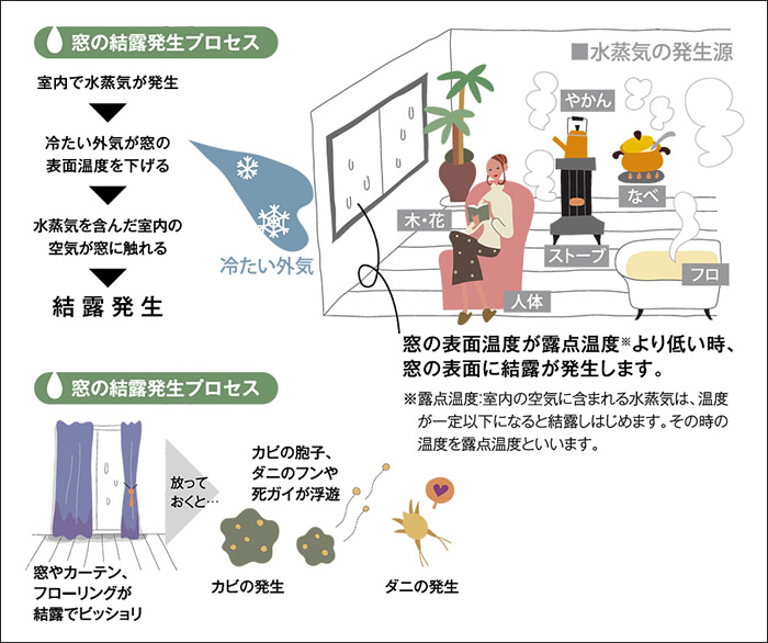 壁や床を汚したり、窓枠材がいたむだけでなく、アレルギー、アトピーを誘発させるカビ・ダニの発生の原因にもなります。
